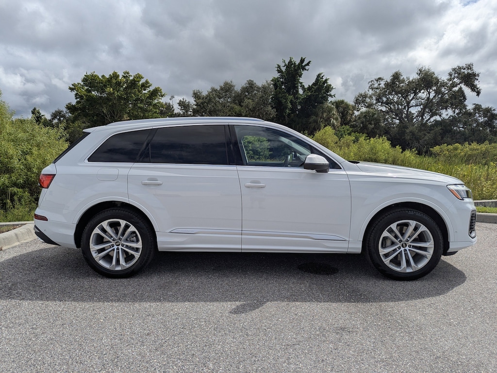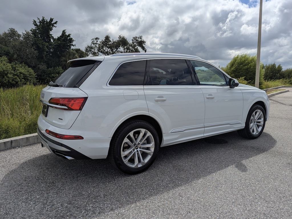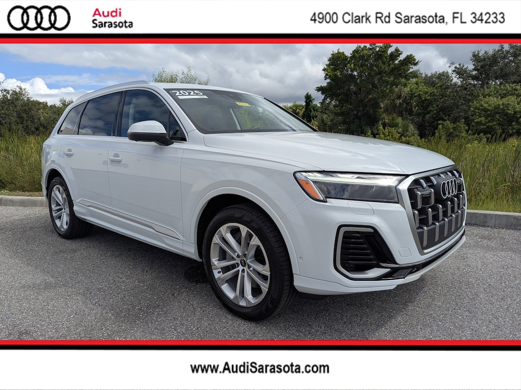 Pricing excludes tax, tag, title and pre-delivery service fee of $999 and private tag agency fee of $24.40. *See below for details..Audi Certified!..Audi Sarasota Courtesy Vehicle with Only 6,171 Miles..This All Wheel Drive Q7 Premium Plus Quattro includes Executive Package with Audi Side Assist Blind Spot Warning with Rear Cross Traffic Alert..Top View Camera System..Lane Departure Warning..Front/Rear Park Assist Sensors..Audi Pre-Sense Basic and Front with Forward Collision Warning and Avoidance Assist..Adaptive Cruise Assist with Lane Guidance..Traffic Sign Recognition..Dual-Pane Acoustic Glass..Bang & Olufsen 3D Sound System..LED Interior Lighting..LED Headlights..High-Beam Assist..Heated Steering Wheel..Wireless Apple CarPlay..Android Auto..Satellite Radio..Bluetooth for Phone & Audio..4-USB Ports..Audi Virtual Cockpit..Hands-Free Power Tailgate..10.1" Upper Touchscreen..8.6" Lower Touchscreen..Digital Instrument Cluster..3-Spoke Multifunction Steering Wheel with Shift Paddles..Heated Auto-Dimming Power Folding Exterior Mirrors..Illuminated Door Sills..4-Zone Automatic Climate Control..Power Adjustable, Heated/Ventilated Leather Seats with Power Lumbar..Heated Rear Seats..7 Passenger Seating with Power Folding 3rd Row..20" Alloy Wheels..Tow Hitch..Roof Rails..Factory Navigation..Two-Panel Panoramic Sunroof..Quattro AWD System..3.0L 335 HP 6 Cylinder..8 Speed Automatic Transmission..All power equipment and much more..All pre-owned cars regardless of make and model are driven and evaluated by our highly qualified service personnel. Call Our Sales Team Now at 941-922-0000 for More Info, a Test Drive Appointment or to have a Custom Video Sent to you on this Vehicle. Fast Out Of State Shipping Available..Over 125 components are inspected by Audi trained technicians to ensure each Audi Certified pre-owned vehicle is in optimal condition. Only after this comprehensive dealer inspection are we confident in backing the vehicle with our Audi Certified pre-owned Limited Warranty, which is more than a seal of approval, it's a badge of honor. When the Audi New Vehicle Limited Warranty expires, the Audi Certified pre-owned Limited Warranty becomes effective and provides coverage for a period of one year or 20,000 miles, whichever occurs first. (See dealer for details)..What the reviews say..The Audi Q7 is one of the best three-row luxury SUVs you can buy. It impresses with a lush interior, smooth performance, and a comprehensive set of tech features. How does the Audi Q7 drive? In our testing, the V6-powered Q7 accelerated from 0 to 60 mph in 5.6 seconds, making the Q7 one of the quicker non-performance vehicles in its class. Acceleration from a stop or on the freeway is smooth, rapid and drama-free. The Q7 is Audi's largest SUV and only three-row model. It's the Audi to get if you have a big family because it seats up to seven passengers. Other SUVs like the smaller Q5 and the Q8, which is the sportier version of the Q7, have two rows that seat up to five passengers. The Q7's spacious seating, comfortable ride, and impressive tech features like the dual center touchscreens and sharp-looking digital instrument cluster all make it suited to ferrying families or large groups. The Q7's sophisticated design, high-tech interior and practicality make it an attractive option if you're seeking a luxury three-row SUV. How comfortable is the Q7? The Q7 is one of the more comfortable vehicles in its class. There's very little road or wind noise. The seating position gives you an expansive view out of the front as well as to the sides and rear. The first and second rows are roomy. A bit rare for the class are three sets of child safety seat anchors across the second row and two in the third row, providing some good child seat placement options. The Audi Q7 proves that family hauling and driving enjoyment aren't mutually exclusive.