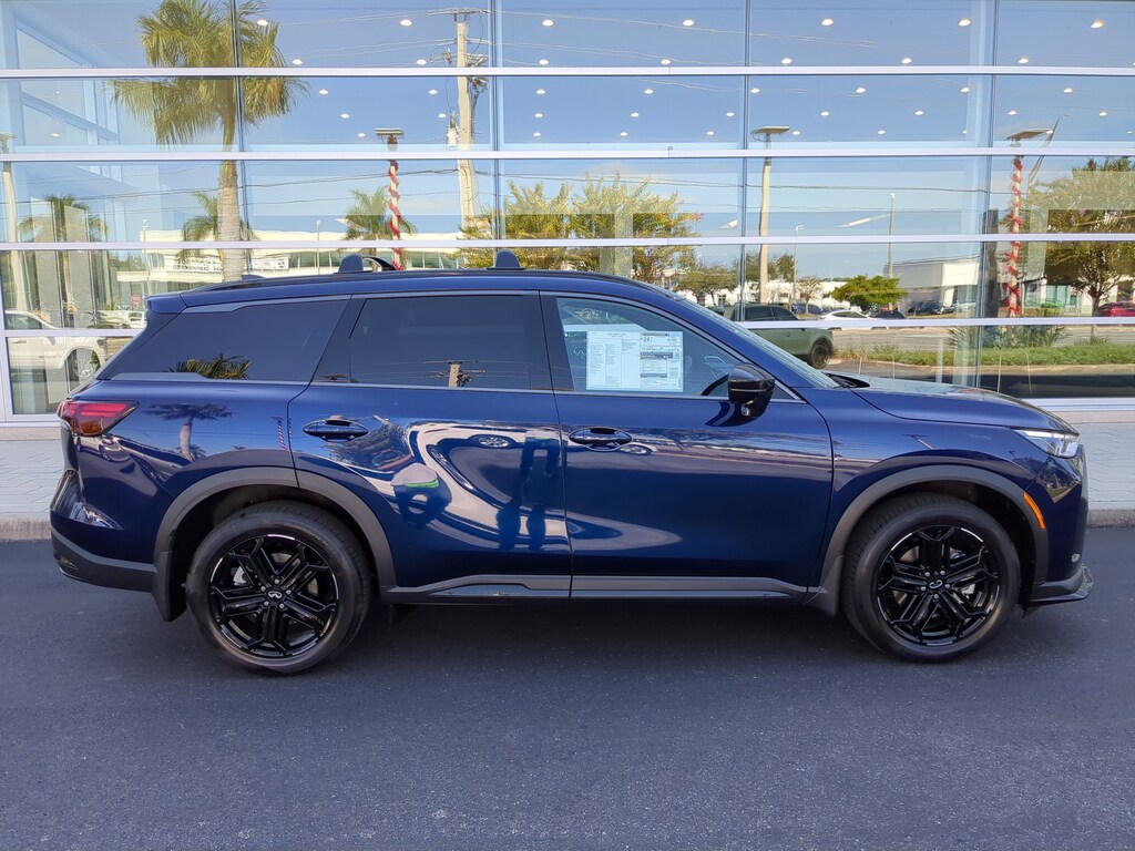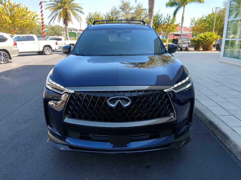 [M93] DARK CARGO PACKAGE -inc: underfloor dividers, Cargo Blocks, Cargo Mat, Medic Kit, Black Rear Bumper Film, Cargo Net , [N94] INFINITI RADIANT DARK ILLUMINATED KICK PLATES -inc: pass-thru light, [L12] CARPETED FLOOR MATS W/CAPTAINS CHAIRS ON 3RD ROW TRAY, [E10] PREMIUM PAINT, [B94] BLACK ROOF RAIL CROSSBARS, [B10] SPLASH GUARDS, Wireless Phone Connectivity, Window Grid And Roof Mount Diversity Antenna, Wheels: 20" x 8J Unique Sporty Machined Alum Alloy -inc: gloss black finish, Valet Function.