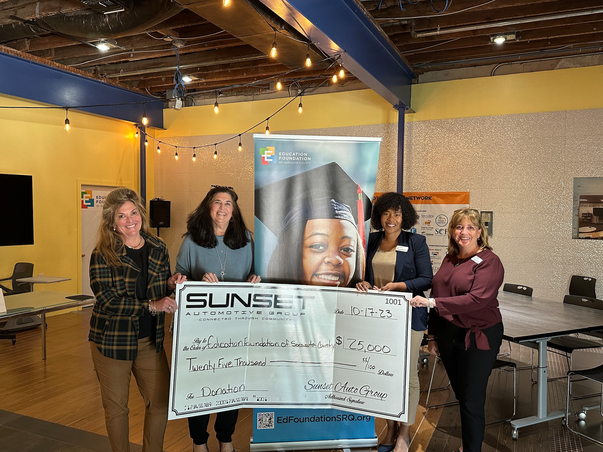 On October 17th, 2023 Sunset Auto Group was honored to present a $25,000 check to the Education Foundation of Sarasota County! The Education Foundation of Sarasota County is here to enhance the potential of students, promote excellence in teaching, and inspire innovation. From all of us at Sunset Auto Group, thank you for all that you do!
