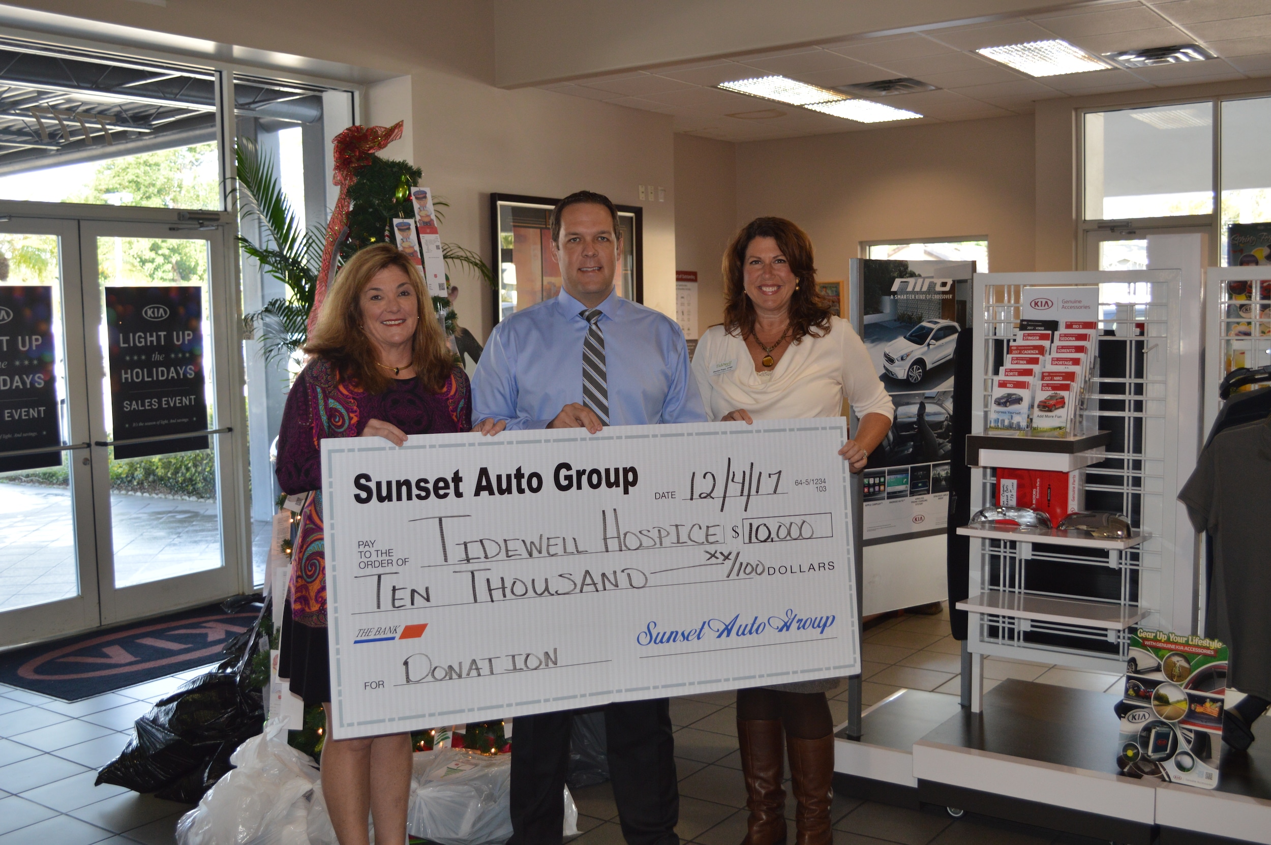 To close out 2017, we were more than honored to present Tidewell Hospice with a $10,000 donation in honor of our longtime employee, Shelly Woolf, who we lost this past year. Shelly will forever be remembered and was the Office Manager at our Sunset Kia Sarasota location. Melissa Crowley, Chief Financial Officer, and Kevin Simmons, General Manager of our Sunset Kia of Sarasota store, presented Denise Pope, Chief Philanthropy Officer, with the check.