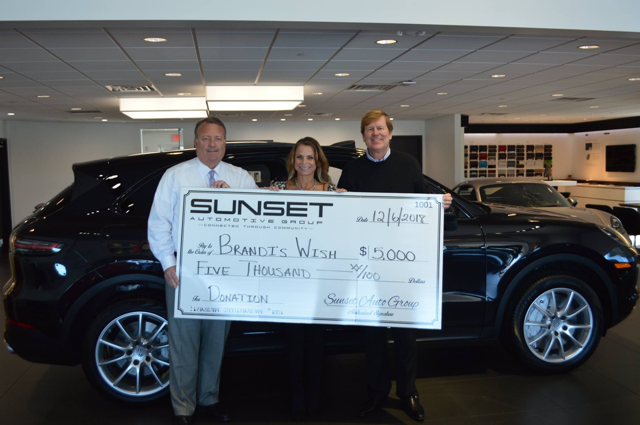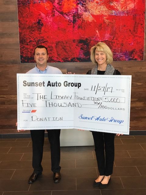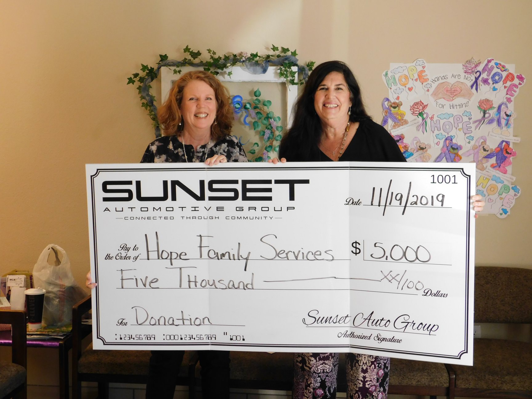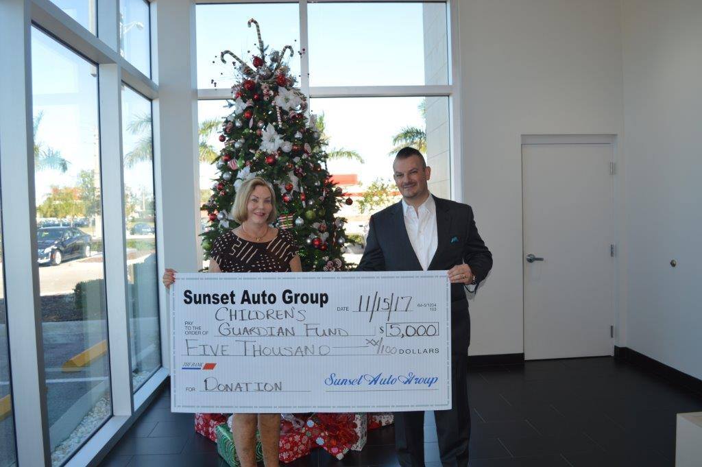 In the spirit of giving back and staying connected through the community, Sunset Auto Group was honored to presented Children's Guardian Fund with a $5,000 donation. Steve Montanaro, presented Carol Belmont, Board Chair of Children's Guardian Fund, with the check on November 15th, 2017.
