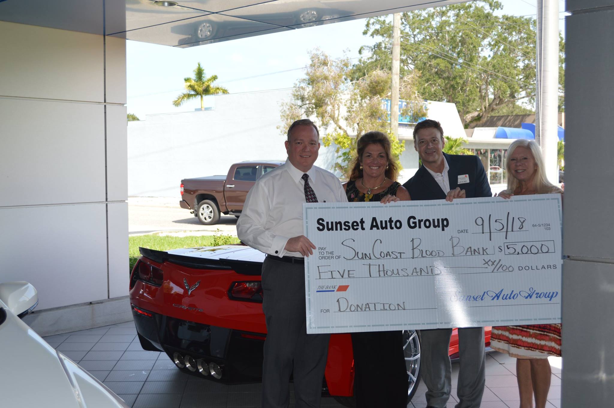 In our mission to stay connected through community, we recently donated $5000 to the Suncoast Blood Bank to assist in purchasing a new blood mobile. Mike Freeman, General Manager of Sunset Chevy Buick GMC, and Melissa McKeehan, CFO, presented Scott Bush, CEO of Suncoast Blood Bank, and Amy Tuten, Event Chair, with the check!