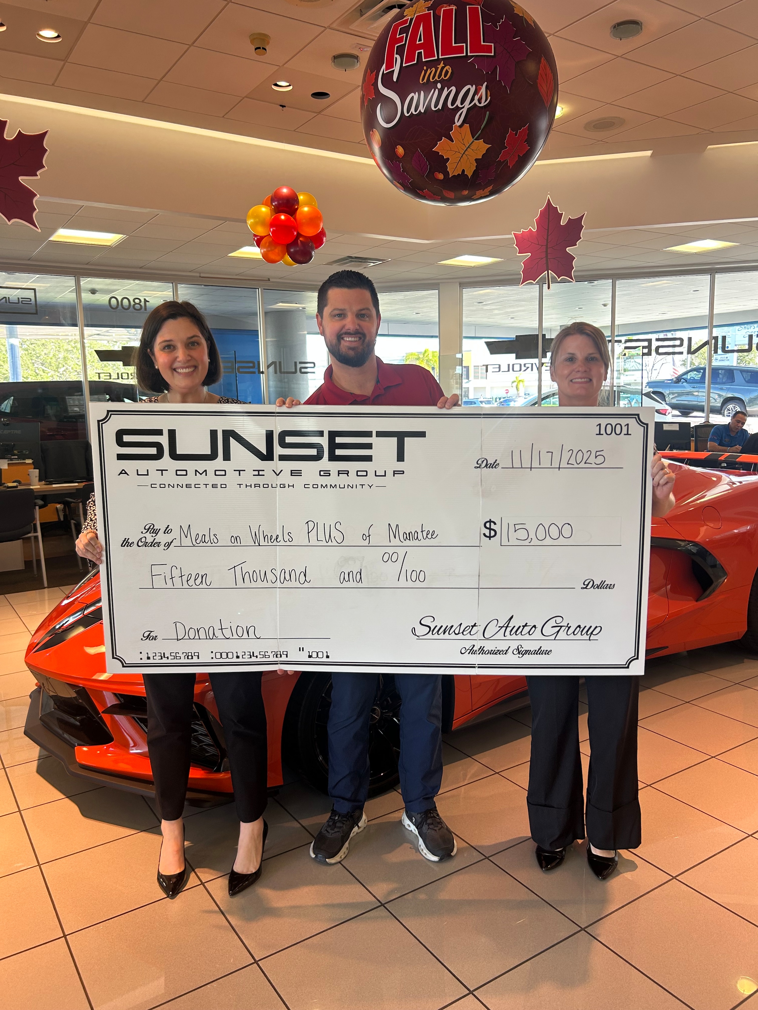 On November 17, 2025, Sunset Auto Group was honored to present a $15,000 donation to Meals on Wheels PLUS of Manatee, supporting their mission to provide meals, care, and essential programs for individuals and families across our community. We sincerely thank Meals on Wheels PLUS of Manatee for their dedication to helping people live independently and thrive in our community.