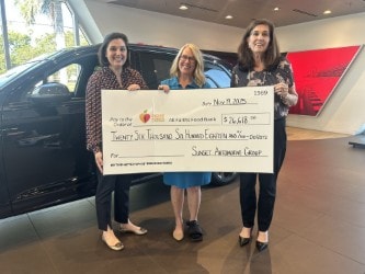 On November 19, 2025, Sunset Auto Group was proud to present a donation of $26,618 to All Faiths Food Bank, the largest hunger relief organization in Sarasota and DeSoto counties. Established in 1989, All Faiths Food Bank was created through a collaboration of local organizations dedicated to feeding those in need and has since grown into a certified member of the Feeding America network. Sunset Auto Group is honored to support their ongoing mission to provide nourishment, support, and hope to families throughout our community.