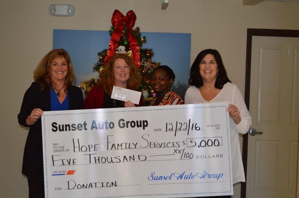 In the spirit of giving, we were honored to present HOPE Family Services in Bradenton, FL with a $5000 donation. Andrea Jackson, Executive Director, presented Laurel Lynch, CEO, with the check! HOPE's primary purpose is to provide services to survivors of domestic violence and help them stay safe, gain strength, and evaluate their options. On behalf of Sunset Auto Group, thank you so much for all you do!