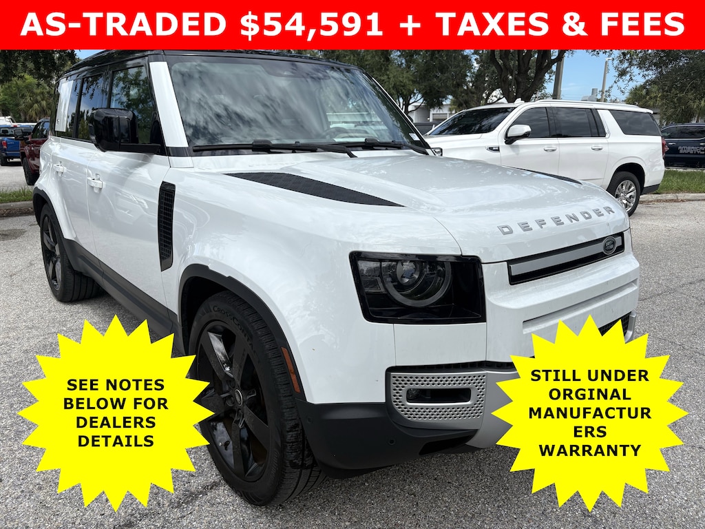CARFAX One-Owner. Yulong White Metallic 2023 Land Rover Defender 110 SE 3.0L I6 4WD **THIS VEHICLE IS BEING OFFERED TO YOU AS AN ALTERNATIVE TO US TAKING IT TO THE AUCTION**, TIRES MEASURE AT 4/32, SAFE BUT WILL NEED REPLACED SOON, STILL UNDER MANUFACTURE ORINGINAL BUMPER TO BUMPER WARANTY, ***VERY NICE AND CLEAN***, 12-Way Heated & Cooled Electric Memory Seats, 15 Speakers, 4-Wheel Disc Brakes, Apple CarPlay & Android Auto, Auto High-beam Headlights, Automatic temperature control, Brake assist, Exterior Parking Camera Rear, Four wheel independent suspension, Front Bucket Seats, Front dual zone A/C, Front fog lights, Fully automatic headlights, Grained Leather Seat Trim, Heated front seats, Leather Shift Knob, Leather steering wheel, Navigation system: Connected Navigation PIVI Pro, Passenger door bin, Power driver seat, Power moonroof, Power passenger seat, Power steering, Power windows, Radio: 700W 15 Speaker Meridian Surround Sound Sys, Rain sensing wipers, Rear fog lights, Security system, Speed-Sensitive Wipers, Split folding rear seat, Steering wheel mounted audio controls, Telescoping steering wheel, Tilt steering wheel, Traction control, Ventilated front seats, Wheels: 20" Gloss Sparkle Silver Style 5094.