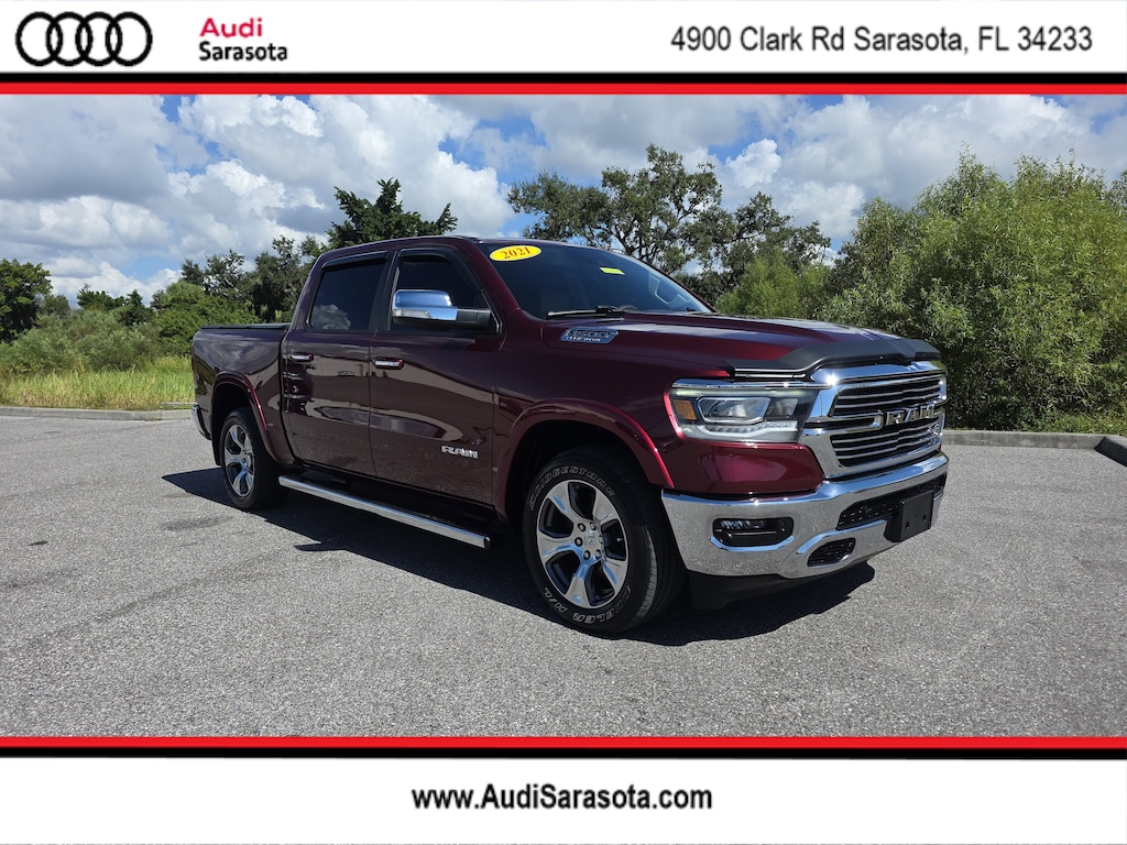 Pricing excludes tax, tag, title and pre-delivery service fee of $999 and private tag agency fee of $24.40. *See below for details..Wow this 4 Wheel Drive, Ram 1500 Laramie Crew Cab 4Dr Pickup includes Preferred Package 27H & Laramie Level 1 Equipment Group with a 5.7L 395 HP Hemi V8..8 Speed Automatic Transmission..ParkView Rear BackUp Camera..Full Speed Forward Collision Warning Plus..Advanced Brake Assist..Automatic High Beam Headlamp Control..BlindSpot and CrossPath Detection..ParkSense Front and Rear Park Assist with Stop..Rain Sensitive Windshield Wipers..Power Tailgate Release..Rear 60/40 Split Folding/Reclining Seat..20" Alloy Wheels with 4 BRAND NEW TIRES...Uconnect 12.0" Display with Navigation..4G LTE WiFi Hot Spot..SiriusXM Satellite Radio..3.92 Rear Axle Ratio..AntiSpin Differential Rear Axle..Class IV Receiver Hitch..Remote Start System..Remote Proximity Keyless Entry..Dampened Tailgate..Apple CarPlay/Google Android Auto..7.0" TFT Color Display Cluster..Full Function Media Hub with 2 USB Plus Aux Port..Integrated Voice Command with Bluetooth..115Volt Auxiliary Power Outlet..115Volt Auxiliary Rear Power Outlet..12Volt Auxiliary Power Outlet..9 Amplified Speakers with Subwoofer..A/C with Dual-Zone Auto Temperature Control..Leather Wrapped Steering Wheel..Heated Steering Wheel..Tilt/Telescope Steering Column..Power Adjustable Pedals with Memory..8 Way Power Driver and Passenger Leather Seats..Heated Front Seats..Ventilated Front Seats..2nd Row In Floor Storage Bins..Rear Power Sliding Window..Ready Alert Braking..Delmonico Red PearlCoat Exterior Paint..Leather Trimmed Bucket Seats..Full Length Upgraded Floor Console..23 Gallon Fuel Tank..Trailer Brake Controller..LED Tail Lamps..Premium Power Mirrors..Exterior Mirrors Courtesy Lamps and more..Call Our Sales Team Now at 941-922-0000 for More Info, a Test Drive Appointment or to have a Custom Video Sent to you on this Car. Fast Out of State Shipping Available!..All pre-owned cars regardless of make and model are driven and evaluated by our highly qualified service personnel. We invite you to come see our brand new state of the art dealership and take a test drive with one of our highly trained Audi Brand Specialists. You will be glad you did..What the reviews say..The 2021 Ram 1500 offers uncommonly smooth driving manners because of its distinct rear suspension design. You also get unique upscale interior highlighted by the optional 12-inch infotainment display. The Ram 1500 truck has been our top-rated light-duty pickup since this latest generation debuted for 2019. It has set the bar for the class in terms of technology integration, interior materials quality and ride comfort while providing stout towing and hauling capabilities. Our test truck had the V8 engine and the eight-speed transmission. They work so well together that we could recommend this truck on that basis alone. It's strong, and it's easy to drive in just about every situation. The Ram 1500 expertly soaks up varying road imperfections and does it without the rough ride you'd normally expect from a light-duty pickup. We also like the Ram 1500's effective climate control system. Passengers in any seat will find plenty of headroom, legroom and shoulder room. The cabin is spacious, and the Ram has more rear legroom and foot clearance than competing trucks. The optional 12-inch touchscreen is a dazzling addition to any vehicle, let alone a pickup truck. It offers a huge map and sharp graphics. The Ram 1500 is a smart and civilized truck that doesn't drive like anything else in its class. Much of that is attributable to its independent rear suspension, which makes it pleasing to drive and gives it an uncommonly smooth ride. Once known for big-rig styling, the Ram 1500 is now more stylish and aerodynamic. This aesthetic carries over inside, where the Ram impresses with a handsome look that is logically laid out and oozes quality. And the 12-inch screen and reclining rear seat never get old.